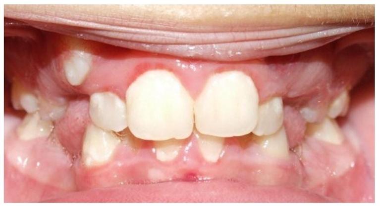Before: Class II Div. 1 malocclusion, Adult Dentition, Protruded Teeth, Midlines Shifting.
